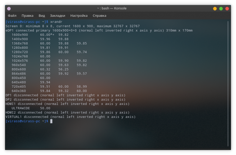 По ответу терминала ищем экран который нам нужен. В моем случае это eDP1.