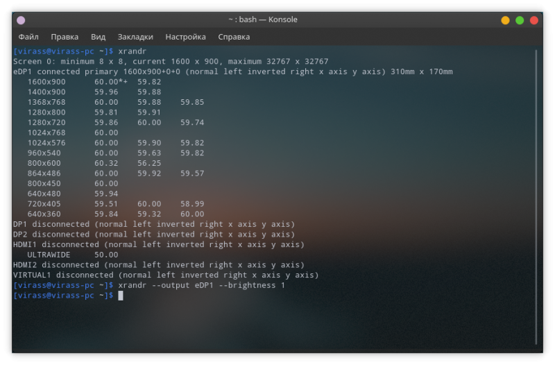 Где --brightness 1 указываем значение яркости. Например 0.5 или 0.8.